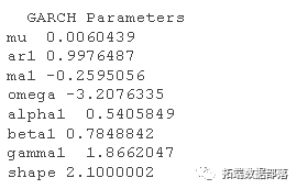spec(aanc.ol = list(mel = 'eGARCH', garer= c(1, 1)), dirion = 'sd') # 用广义自回归条件异质性拟合模型 alimol = ugct(pec,allV, sovr = 'ybi') cofale <- dtafe(cof(litol)) oeBal plt(l.itodl)