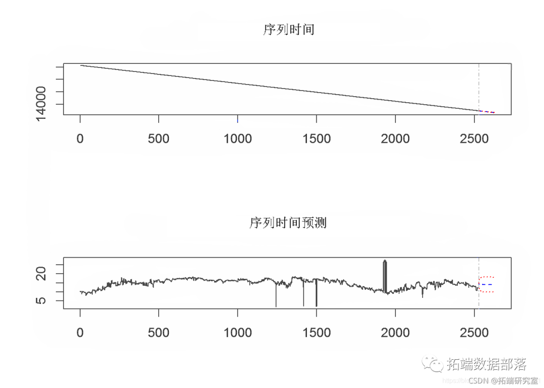为了开始估算数据所隐含的未来事件,我们进行了初步的风险值估算。首先,所有行的平均值和日期信息的数据框架被转换为时间序列格式,然后从这个时间序列中计算出风险值。根据VaR计算对未来100天和500天的价值进行预测。在随后的预测图中,蓝色圆圈代表未来100天的数值,红色圆圈代表500天的回报值。