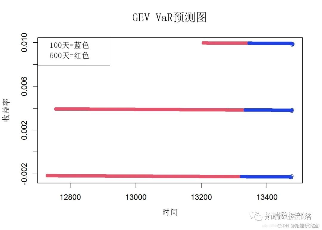 为了从 Block Maxima 数据中创建风险价值 (VaR) 估计,将 10 股指数 GEV 数据转换为时间序列。VaR 估计是根据 GEV 时间序列数据进行的。未来值的预测(未来 100 天和 500 天)是从 VaR 数据推断出来的。在结果图中,蓝色圆圈表示未来 100 天的值,红色圆圈表示 500 天的收益率值。