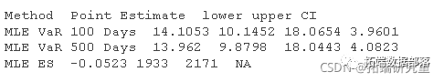 最后,给出了 10 个股票指数 MLE 未来价值的估计结果表。3 个 MLE VaR 估计值(和 MLE 期望损失ES)的点估计值和范围被制成表格来比较。