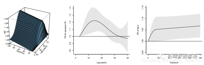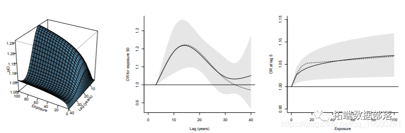 图中的3-D图再次被解释为职业暴露与癌症风险之间的关联。在此示例中,滞后时间段以年为单位表示。该图表明风险的初始增加(以比值比(OR)衡量),然后降低。从横截面来看,图中估计的滞后反应曲线显示了暴露后10至15年的风险峰值,尽管置信区间非常宽泛,但风险在暴露后30年回到基础水平。