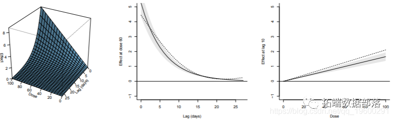 代码的第一行产生图1中的图形,显示效果在剂量和滞后值的范围内如何变化。该图表明,在摄入后的头几天,该剂量的药物作用明显,然后在15-20天后趋于消失。从横截面来看,图分别显示了暴露60的滞后反应曲线和滞后10的暴露-反应曲线。图中的滞后反应曲线表明了效应的指数衰减。