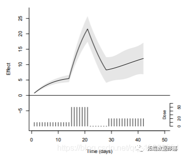 与在整个滞后期间没有暴露的受试者相比,估计的OR为3.5(95%CI:1.2–9.9)。可以使用相同的方法来获取特定暴露量分布随时间的动态预测。这个思想是基于假定的暴露-滞后-反应关联,在给定随时间变化的暴露历史的情况下,及时地动态预测风险。实际上,对于每个给定的时间,随着特定的暴露事件涉及不同的滞后时间,暴露历史会发生变化。举例来说,我展示了如何使用试验数据分析来估算特定药物处方后的动态预测效果。