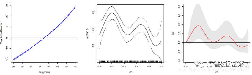 该代码使用通过函数s()的回归样条,对带有多个变量的模拟数据执行GAM估计平滑关系。也可以使用dlnm获得预测和绘图,其中: