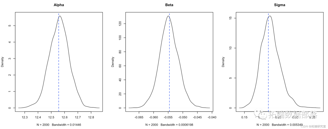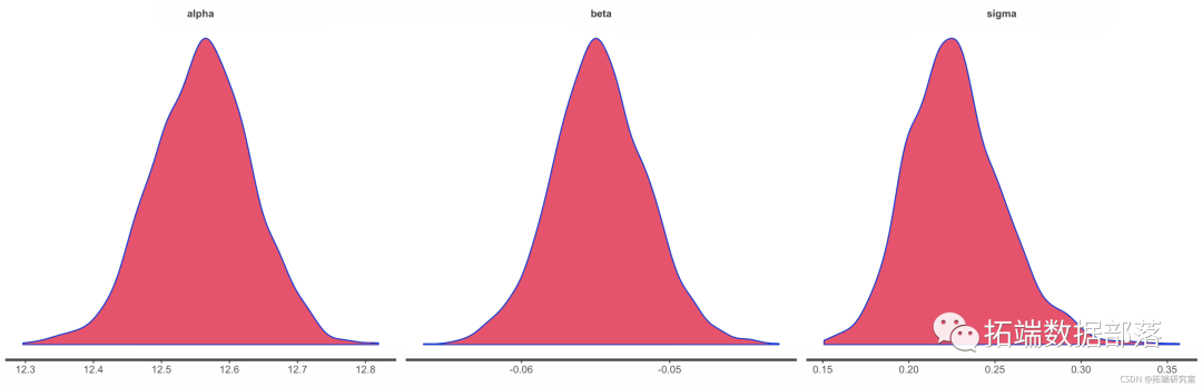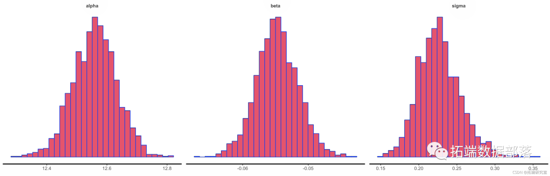 图 10.Stan 模型中截距、斜率和残差方差的后验密度图和直方图 。