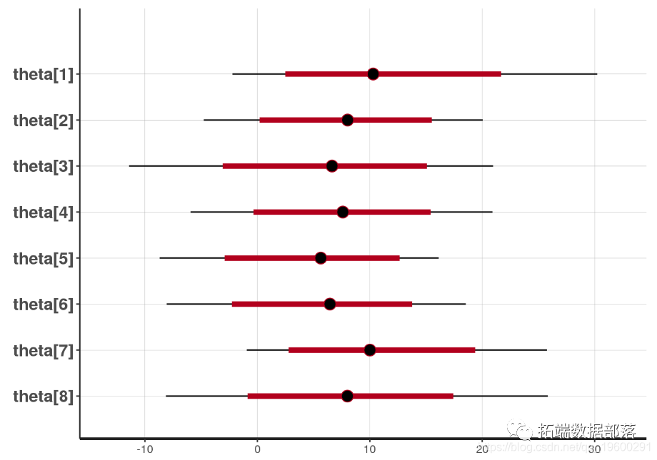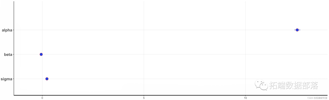 我们可以生成指示平均参数估计值和我们可能感兴趣的任何置信区间的图。请注意,beta 和 sigma 参数的 95% 置信区间 非常小,因此您只能看到点。根据您自己数据的差异,当您进行自己的分析时,您可能会看到更小或更大的置信区间。