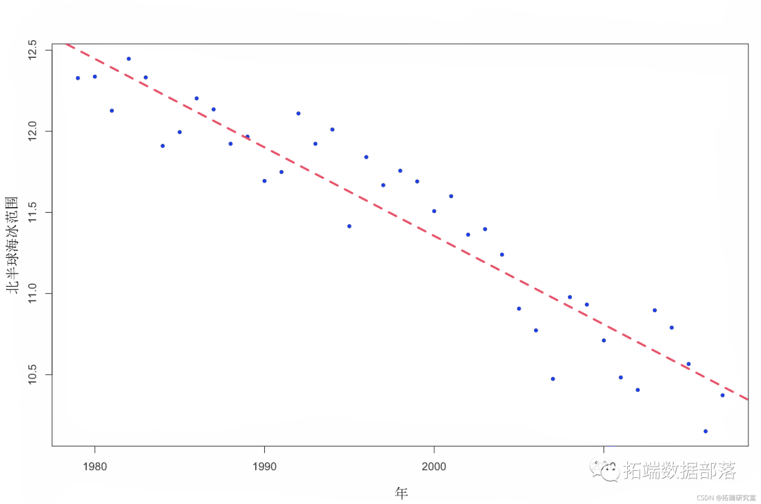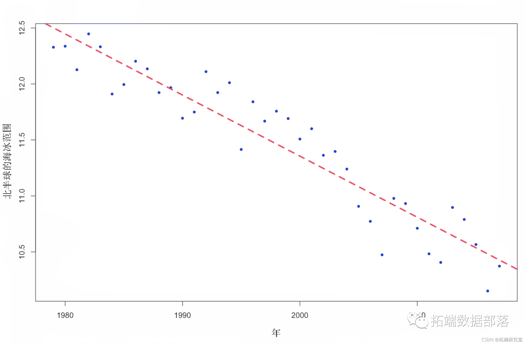 图 2. 北半球海冰范围随时间的变化(加上线性模型拟合)。