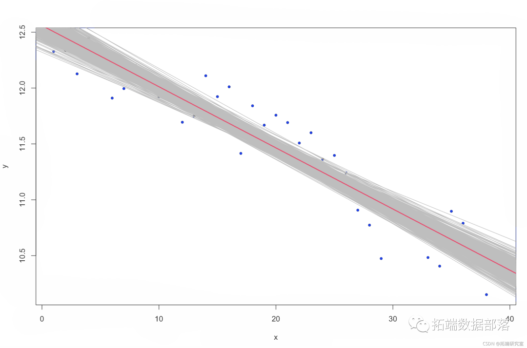 结果与lm 输出相同 。这是因为我们使用了一个简单的模型,并且在我们的参数上放置了非信息先验。