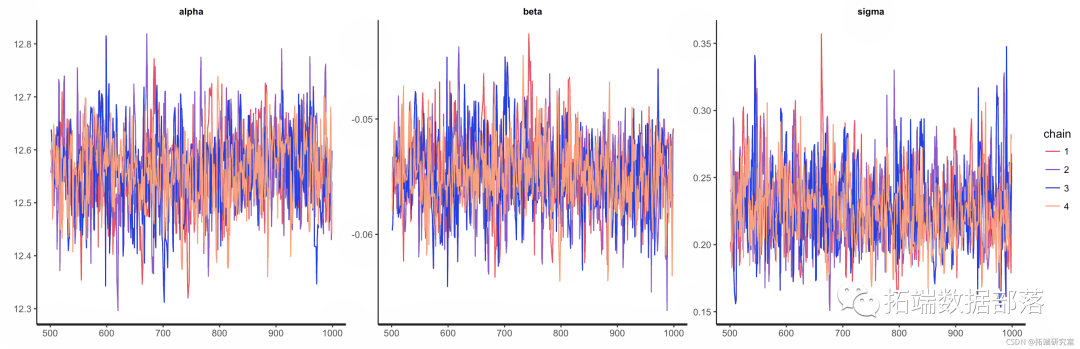 在继续之前,我们应该再次检查模型参数的 Rhat 值、有效样本大小 ( n_eff) 和跟踪图,以确保模型已收敛且可靠。