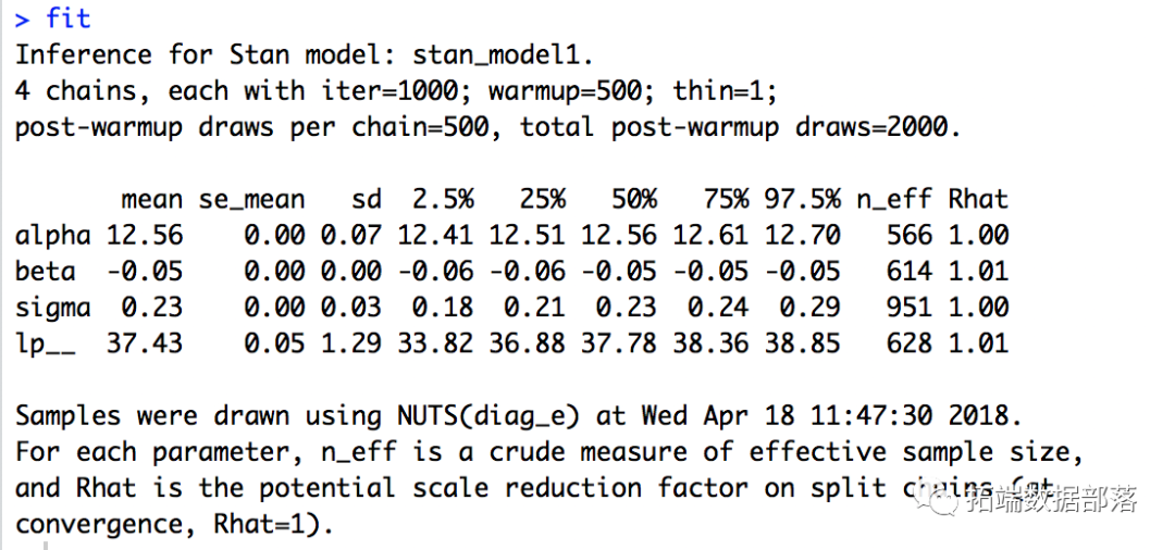 我们可以通过执行对象的名称来获取参数估计和采样器诊断的汇总统计信息: