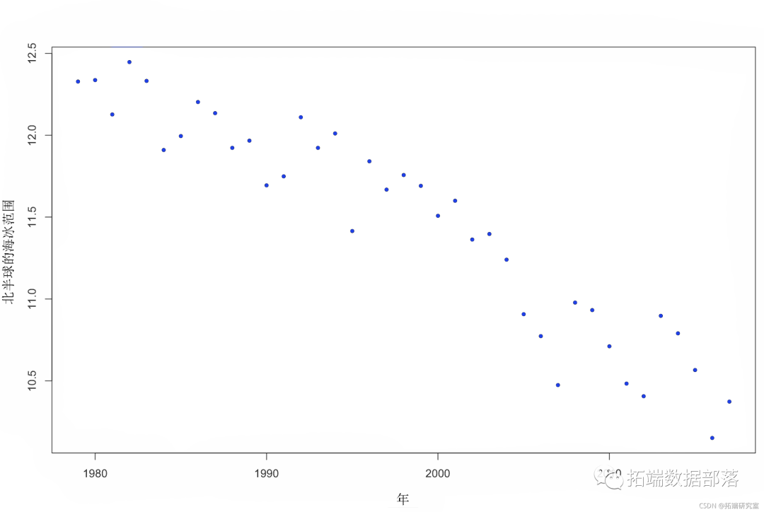 首先,让我们找到一个可以拟合简单线性模型的数据集。 气候变化对地球最显着的影响之一是北半球每年海冰范围的减少。让我们使用 Stan 的线性模型探索海冰范围如何随时间变化。