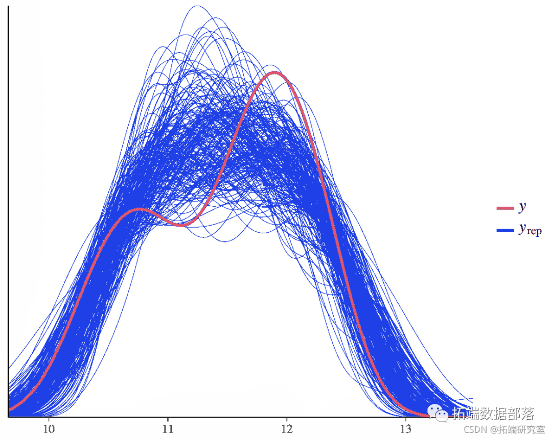 在这里,我们看到数据(深蓝色)与我们的后验预测非常吻合。