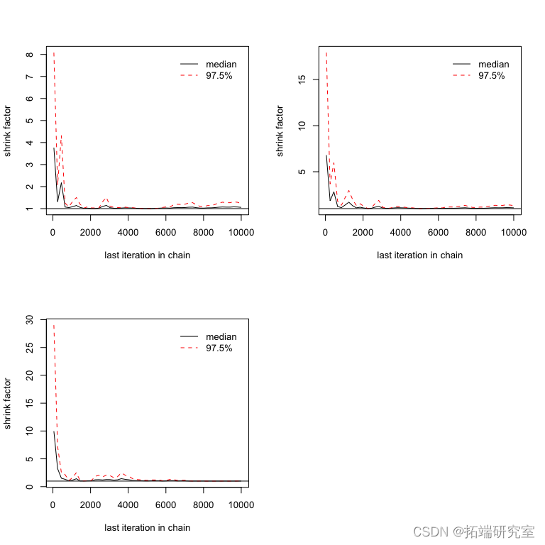 diag 为您提供每个参数的比例缩减因子。因子 1 意味着方差和链内方差相等,较大的值意味着链之间仍然存在显着差异。