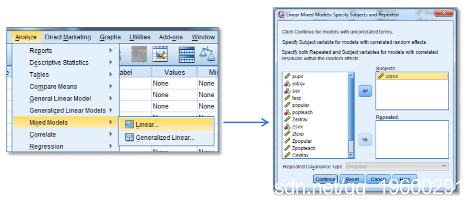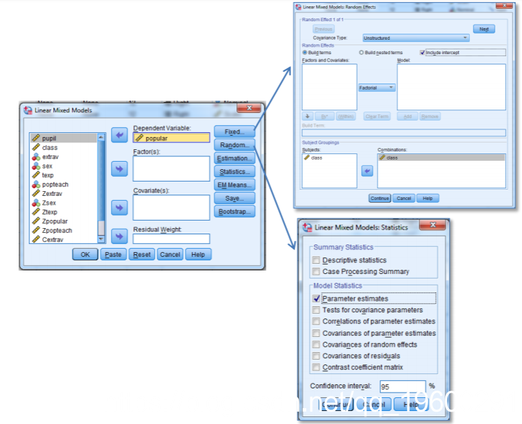 需要在“随机”窗口中指定非结构化协方差类型。这些结果与其他程序和本文得出的结果相同。请注意,像SAS和Mplus一样,SPSS报告方差分量的标准误差,而HLM和R报告标准差。我们无法得出结论,哪个更适合报告,但是差异不会影响这些参数的p值。