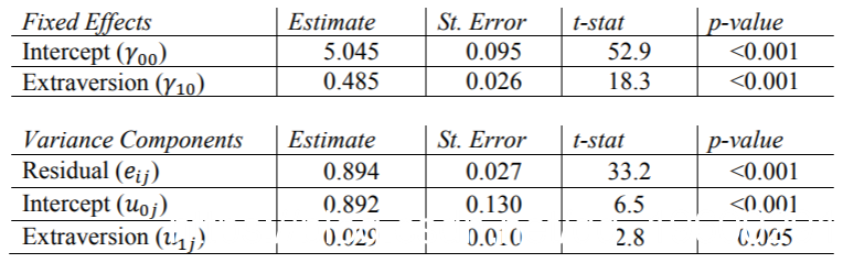 该模型包含Extrav的随机斜率,这意味着我们允许回归方程的斜率随类而变化。该模型比以前的模型更适合于所使用的变量,因为可以直观地假设外向因类而异。