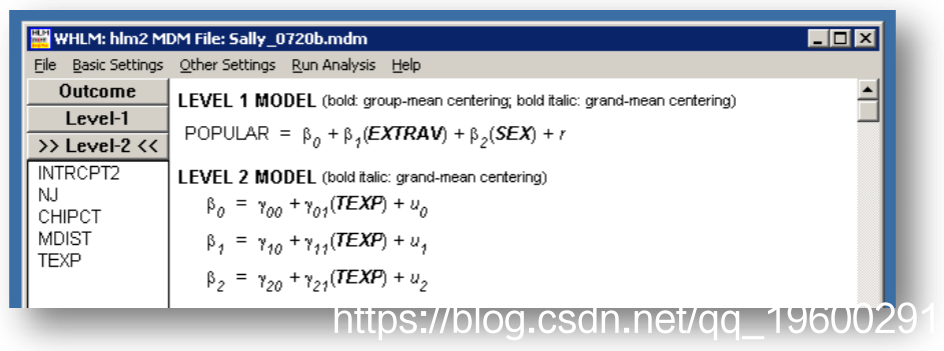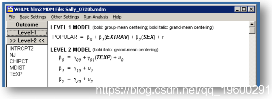 在分层格式中, 可以看到它具有固定的斜率系数,并且对于每个类j都是唯一的。该模型在教师的经验和学生水平的变量之间没有任何相互作用。如果我们有理由相信Texp不会缓和Sex和Extrav对Popular的影响,那么我们将使用此模型,这意味着我们的学生水平变量的斜率是相同的,无论学生是否有新教师或新教师。一位拥有多年经验的人。