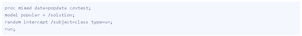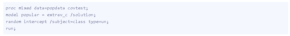 需要“ covtest”选项来报告方差分量估计的标准误差。另外, 需要指定非结构化协方差矩阵类型,这是HLM和R默认情况下使用的类型,我们在这里使用它进行比较。SAS的输出等于Hox的书表2.1中的结果。我们可以得出结论,各类别之间的平均人气得分为5.078,并且各类别之间的差异(1.221)比不同类别之间的差异(0.702)多。当我们为该模型计算ICC时,将对此进行进一步讨论。