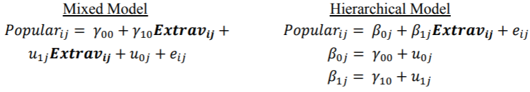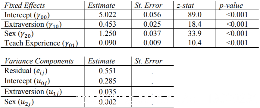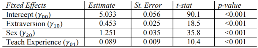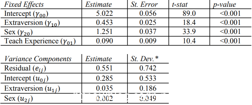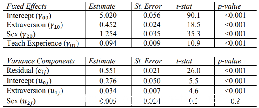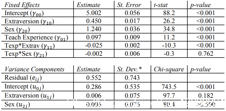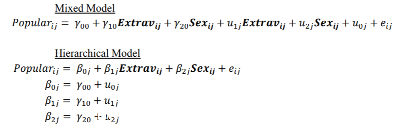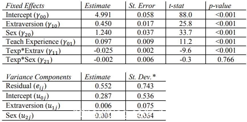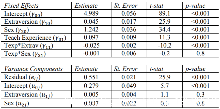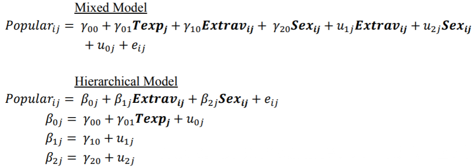 可以看到,在分层格式中,Texp在三个方程式的每个方程式内都有一个斜率系数。这与混合模型中的交互项有关,即通过外向的教师体验和按性别的教师体验。