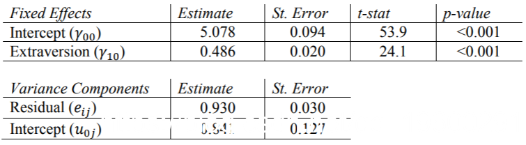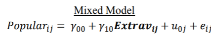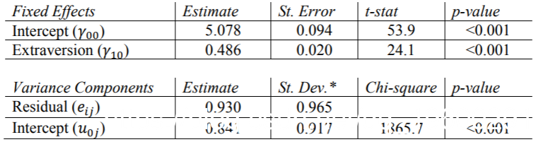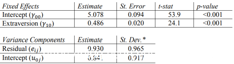 使用一个学生水平的固定因子,“流行”总变化的几乎一半可以由该学生的班级和学生水平的固定因子“外向”解释