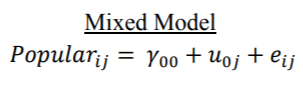 无条件混合模型规范类似于单因素方差分析,其总体均值和类效应。但是,我们将其视为随机效应(均值为零的正态分布变量),而不是像方差分析中那样的固定因子效应。因此,我们将估计值解释为每个类别的平均数在总体平均人气得分附近的方差。