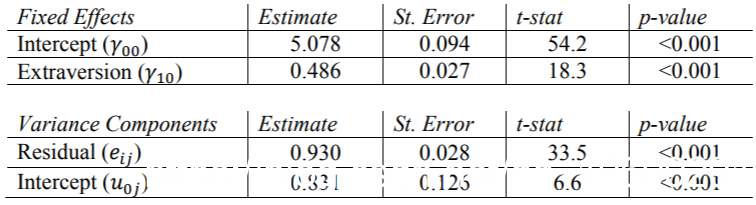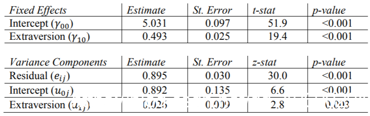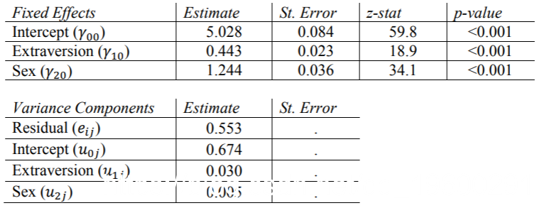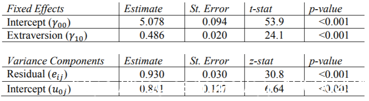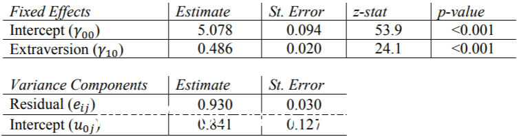 当我们向Stata中的模型添加预测变量时,我们添加了cov(un)选项,指定了非结构化协方差矩阵。我们将 Extraversion变量放在“ ||”之前 表示它是一个固定因子(具有非随机斜率)。这些结果与其他程序的结果相同。