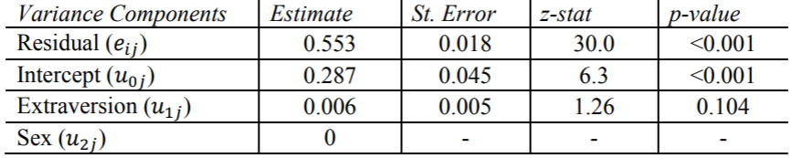 在随机方差分量表中,我们看到外向随机斜率的估计值和性别随机斜率的估计值与零没有显着差异。这意味着没有证据表明这两个因素实际上在该模型中因类别而异。