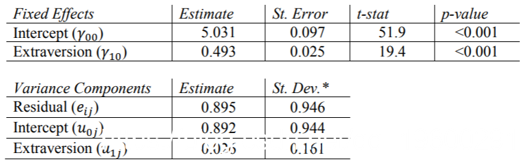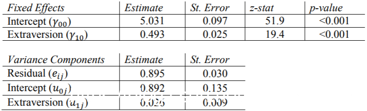 这次我们在WITHIN语句中包括一个潜在的斜率变量,以将Extrav指定为随机因子,该变量告诉Mplus不要在数据集中寻找“ randoms1”,因为没有观察到它。 可以将此变量的输出解释为Extrav的随机斜率分量。我们必须这样做,因为Mplus是为结构方程模型设计的,其多级模型功能是其潜在潜伏分析程序的改编。