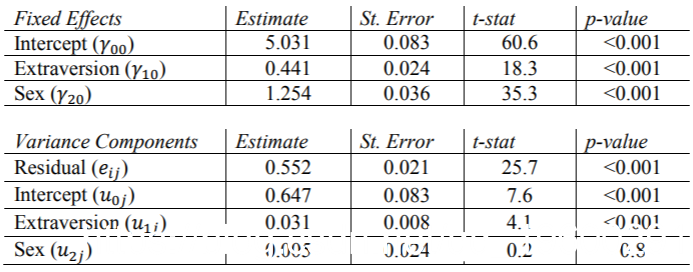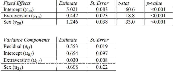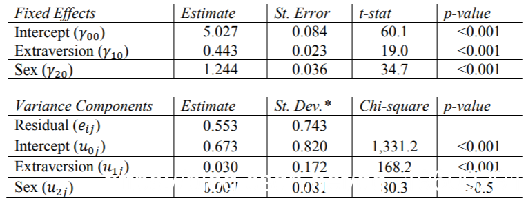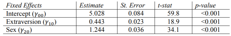在此输出中,我们可以看到性别确实对学生自我报告的知名度有重大影响(p值<0.001)。对Sex的固定估计意味着,在Extrav不变的情况下,女学生(Sex = 1)的普遍得分比男学生(基线组,Sex = 0)高1.244。