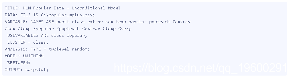 因为这是一个无条件模型,所以我们不需要指定任何WITHIN或BETWEEN变量。下面列出了在MODEL语句中列出变量的标准。在以下各节中,我们将看到前三个示例: