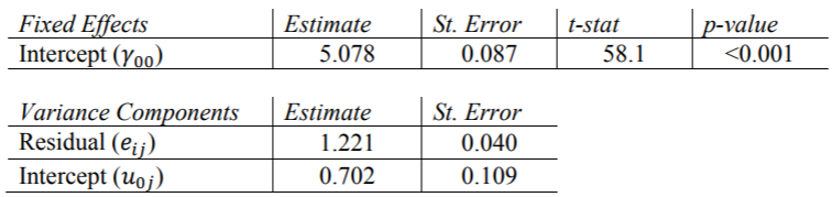 总体而言,这六个程序对于仅截取模型产生了非常相似的结果(唯一的差异发生在随机效应的Mplus估计中)。唯一的区别是他们如何报告随机方差估计的精度。此模型的ICC等于: