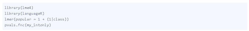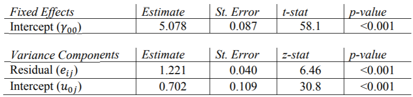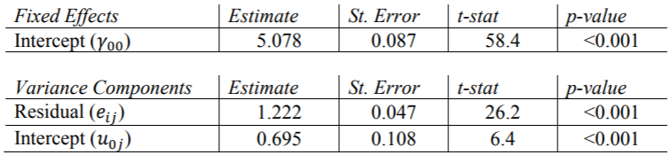 估算值是每个班级的“大众”平均值的平均值,而不是研究中所有学生的平均值。如果数据完全平衡(即每个班级的学生人数相同),则无条件模型的结果将与方差分析程序的结果相同。
