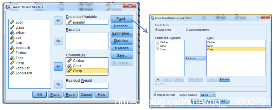 流行的数据集由来自不同班级的学生组成,并且由于每个学生都属于一个唯一的班级,因此它是一个嵌套设计。因变量是“流行”,它是一个自评的流行度,范围为0-10。预测指标包括学生级别的性别(二分法)和Extrav(连续的自我评价的外向得分),以及班级的Texp(多年的老师经验, 是连续的)。