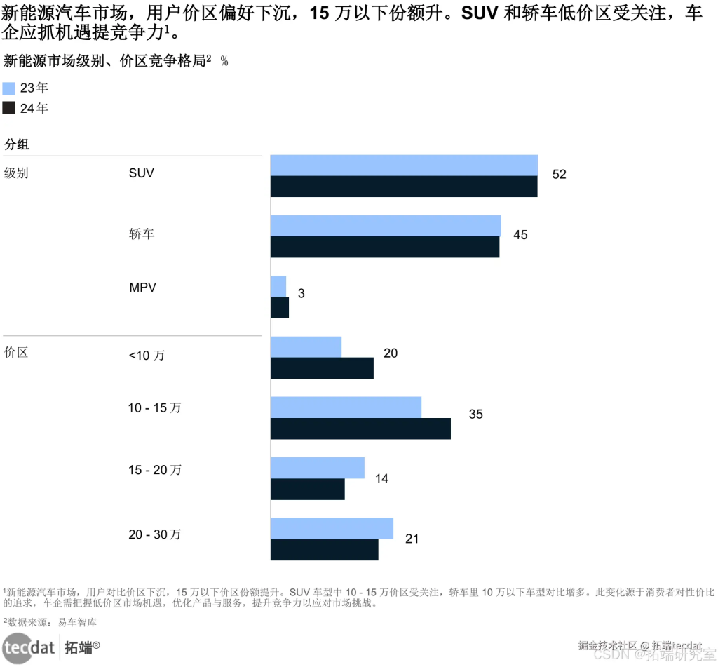 2024年与2023年相比,新能源汽车市场在整体车型级别(如小型车、中型车、大型车等分类)的份额变动幅度较小。从宏观层面看,各类别车型在市场中的占比保持相对稳定。然而,当深入到级别细分的价区维度时,变化则十分显著。数据显示,用户对比价区下沉,15万以下价区份额呈现明显的增长趋势。