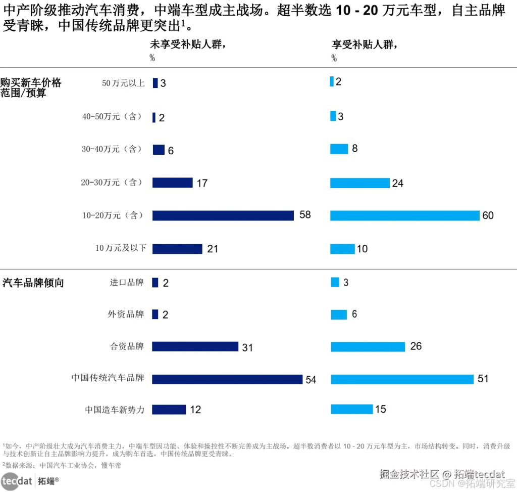 中产阶级成为汽车消费主力,中端车型成为主战场,超半数消费者选择 10 – 20 万元的车型,且伴随消费升级,自主品牌尤其是中国传统品牌更受青睐,汽车消费市场结构逐步转变。