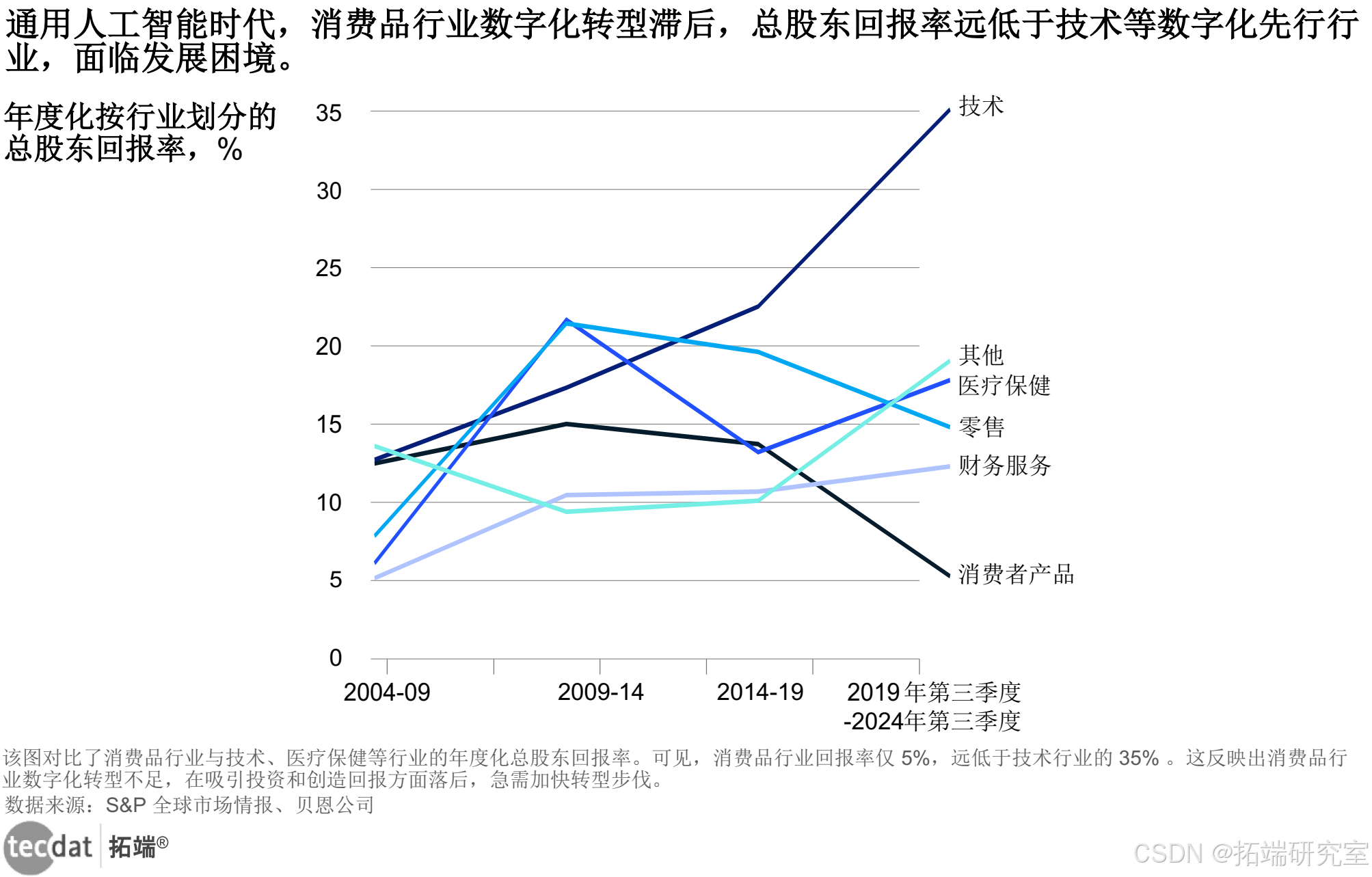 从盈利状况看,尽管部分公司因投入成本降低,上半年息税前利润(EBIT)比率有所提高,但受供应链波动和销售、一般及管理(SG&A)支出上升影响,仍低于疫情前水平。在资本市场,以市值计最大的消费品公司五年年均股东回报率下降超一半,总股东回报(TSR)落后于技术、金融服务等数字化转型更好的行业,这反映出投资者对消费品行业价格驱动增长模式可持续性的担忧。