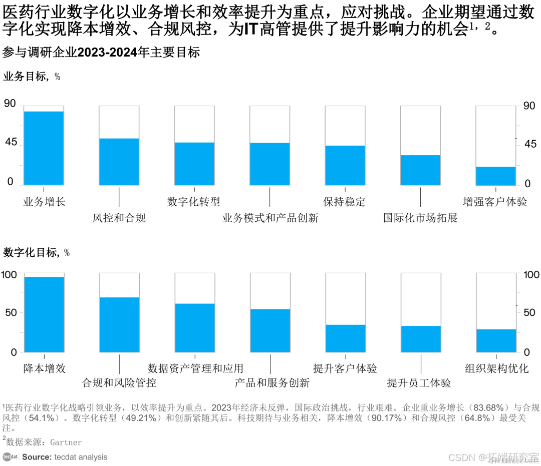 在充满挑战的2023年,医药企业将业务增长(82.78%)和风控合规(54.3%)作为核心目标。降本增效(90.07%)和合规及风险管控(64.9%)是科技应用的主要方向,数据资产管理与应用、产品和服务创新等也是关注重点。 ![]()