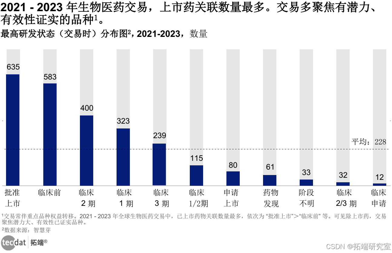 2021 – 2023 年全球生物医药交易中,上市药物关联最多。交易聚焦上市及有潜力、有效性证实的品种。总体呈现出 “批准上市” 的药物在交易中数量最为突出,其次是 “临床前” 阶段的药物,接着依次为 “临床 2 期”“临床 1 期” 和 “临床 3 期”。这充分表明,除了那些已经被市场所证实的上市药物之外,交易更多地将目光聚焦在那些具有巨大潜力且有效性已经得到一定程度证实的品种上。
