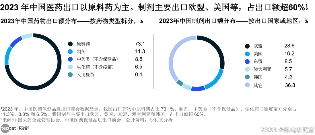 2023 年中国医药出口以原料药为主,占比 73.1%。制剂、中药类(不含保健品)以及生化药(除疫苗)的占比相对较小,分别为 11.3%、8.8% 和 6.5%。制剂主要出口欧盟、美国、东盟、澳大利亚和韩国,共占出口额超60%。