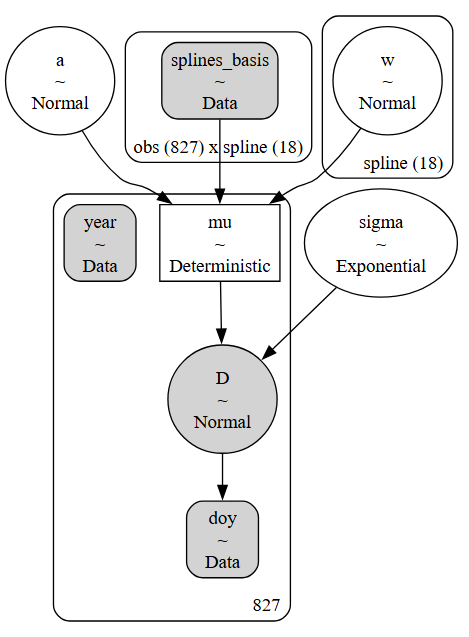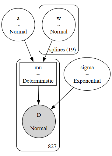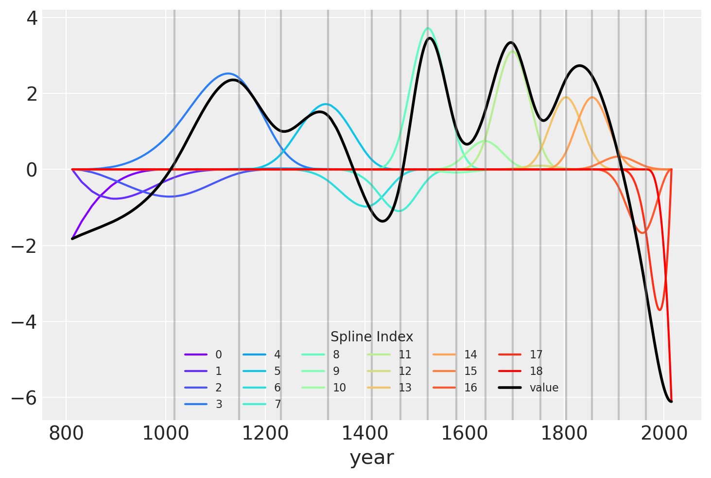 w = pm.Normal("w", mu=0, sigma=3, dims="spline")