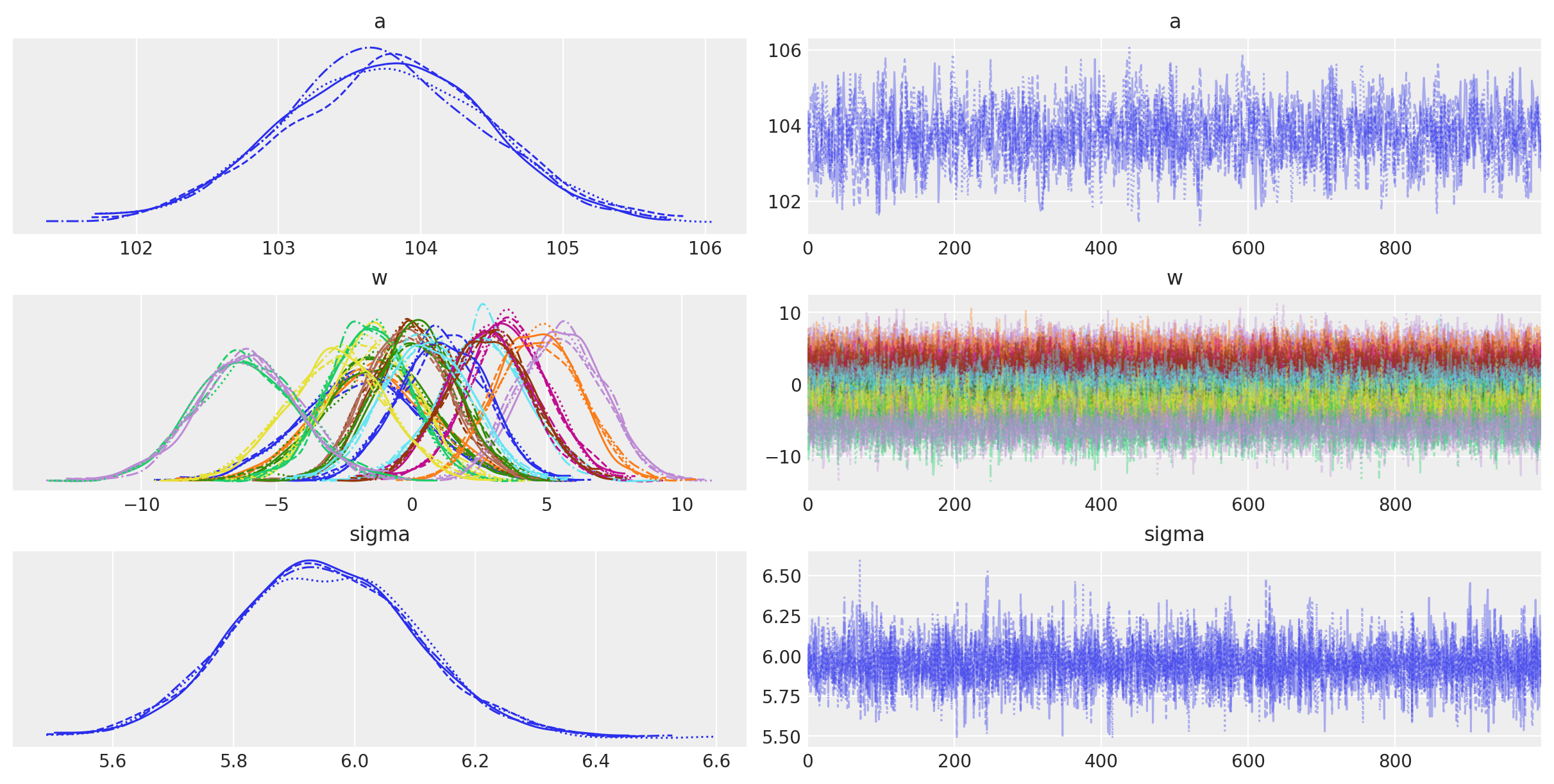 2. AI提示词:使用arviz库绘制模型参数a、w、sigma的迹图,观察参数的收敛情况和分布特征