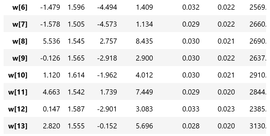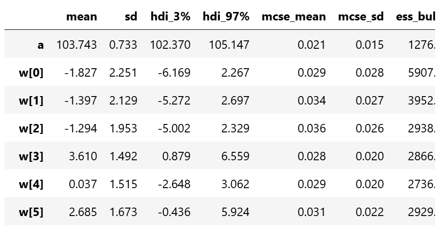 - AI提示词:使用arviz库对模型后验抽样结果idata进行分析,计算模型参数a、w、sigma的摘要信息,包括均值、标准差、有效样本大小等