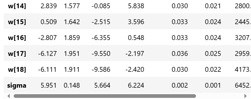 从参数估计的结果来看,截距a和标准差σ的后验分布比较窄,而参数w的后验分布较宽。这可能是因为估计a和σ时使用了所有的数据点,而估计每个w值时只使用了部分数据。