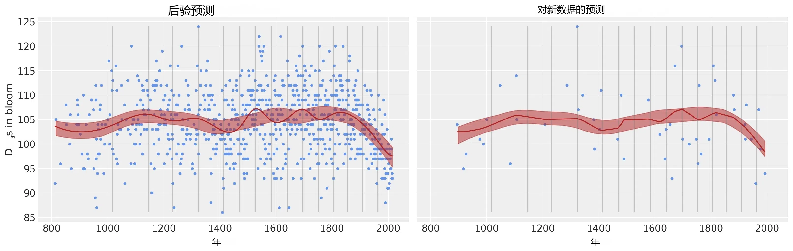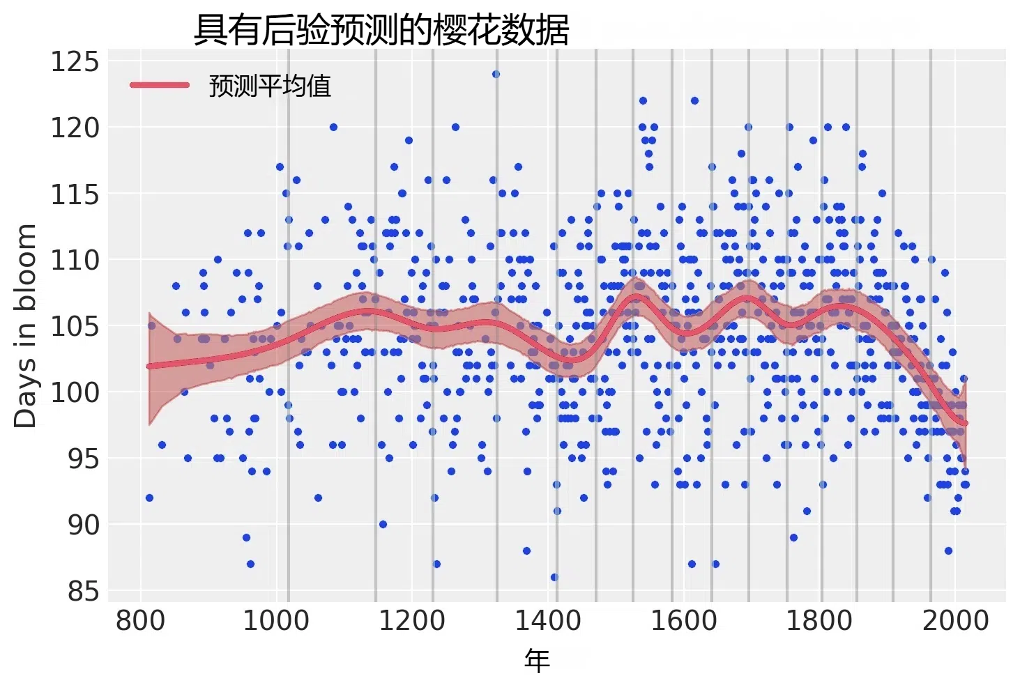 - AI提示词:使用PyMC库重新定义模型,添加Data容器,将原始数据中的年份和开花天数作为Data变量,设置模型的坐标信息,构建样条基矩阵等