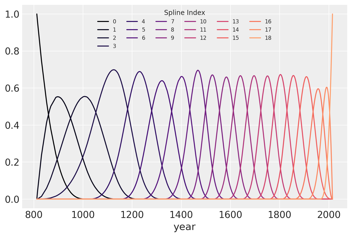 在这个模型中,我们使用了15个节点将年份数据分成了16个部分,并使用patsy库创建了三次样条基矩阵B。