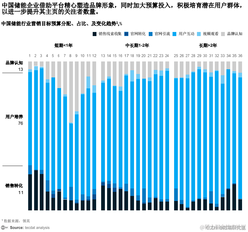 高达76%的预算和资源投入在用户培养上,说明中国储能企业深刻认识到潜在用户的重要性。企业可以精准定位目标用户群体,推送定制化内容,与用户建立互动关系,提升用户粘性和忠诚度。同时,企业还可以收集用户反馈,优化产品和服务,进一步满足用户需求。