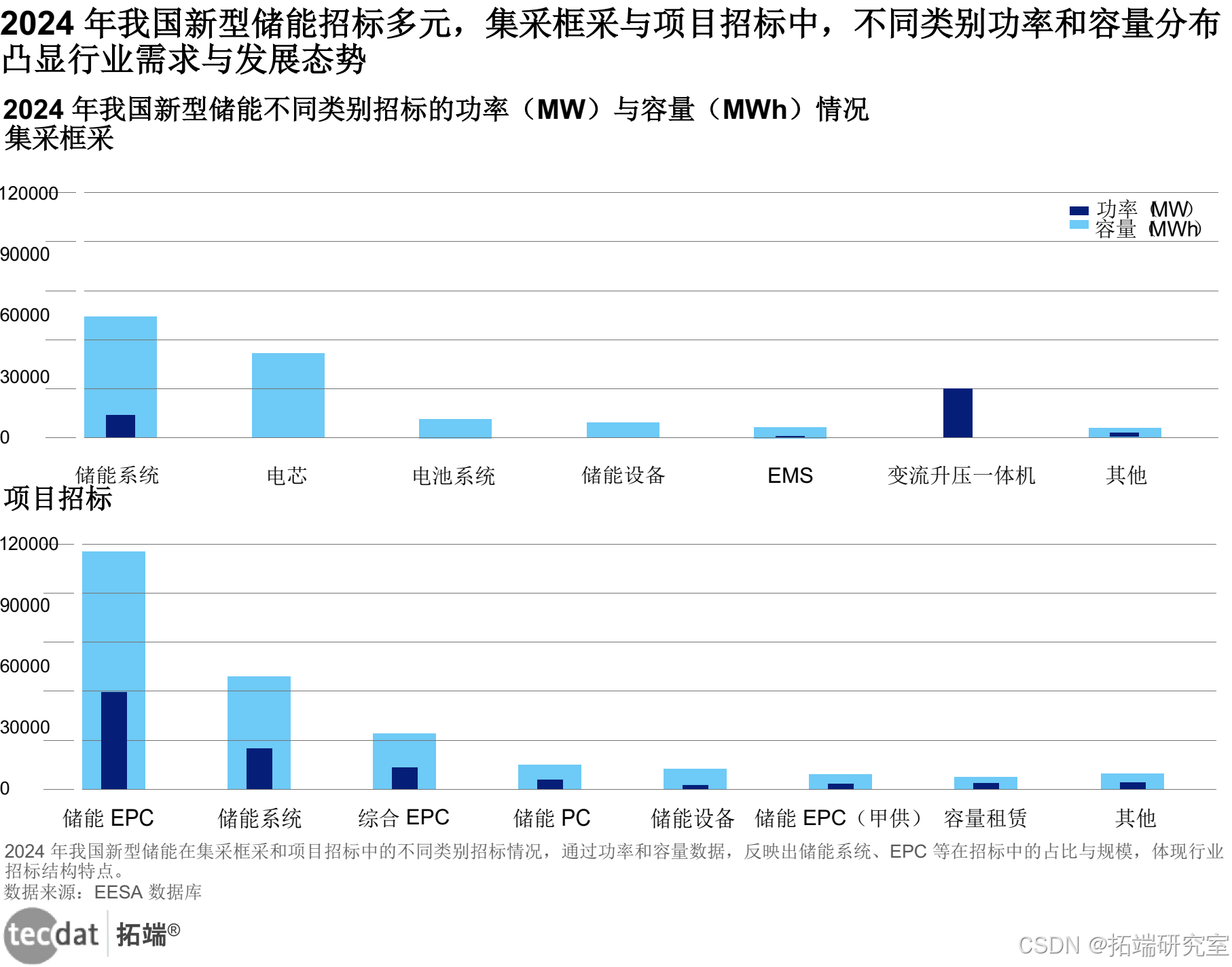 招标方面,EESA数据库显示,2024全年共追踪到新型储能招标信息2465条,总规模达126.1GW/368.2GWh。集采框采和项目招标规模均大幅增长,且招标技术类型愈发多元化,磷酸铁锂电池储能虽仍占主导,但其他技术路线也在不断发展。中标规模同样再创新高,全年追踪到1353条中标信息,总计规模达90.7GW/234.5GWh,其中EPC和储能系统中标项目规模同比增幅显著。中标价格方面,储能系统单瓦时价格和EPC中标价格均有所下降,反映出行业成本的降低。