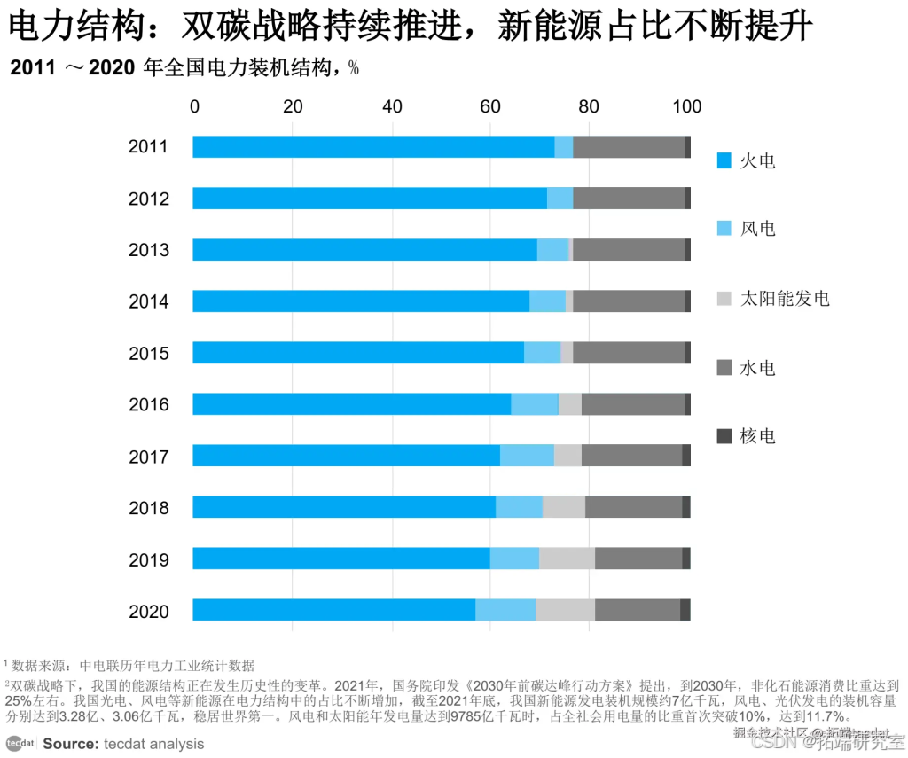 从碳排放数据来看,能源领域主导中国碳排放,近九成。火电比重高致能源排放突出,如2020年煤炭占比达70%。电力行业居能源排放之首,总占比上升,远超同行。