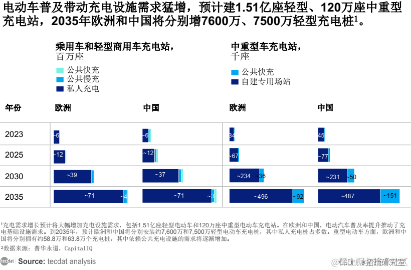 对于轻型电动车:到2035年,预计欧洲的充电桩安装量将达到约7,600万个,而中国约为7,500万个。其中,私人(慢速)充电桩将占据安装基数的主要部分,这反映了消费者更倾向于在家中或工作场所进行充电的偏好。