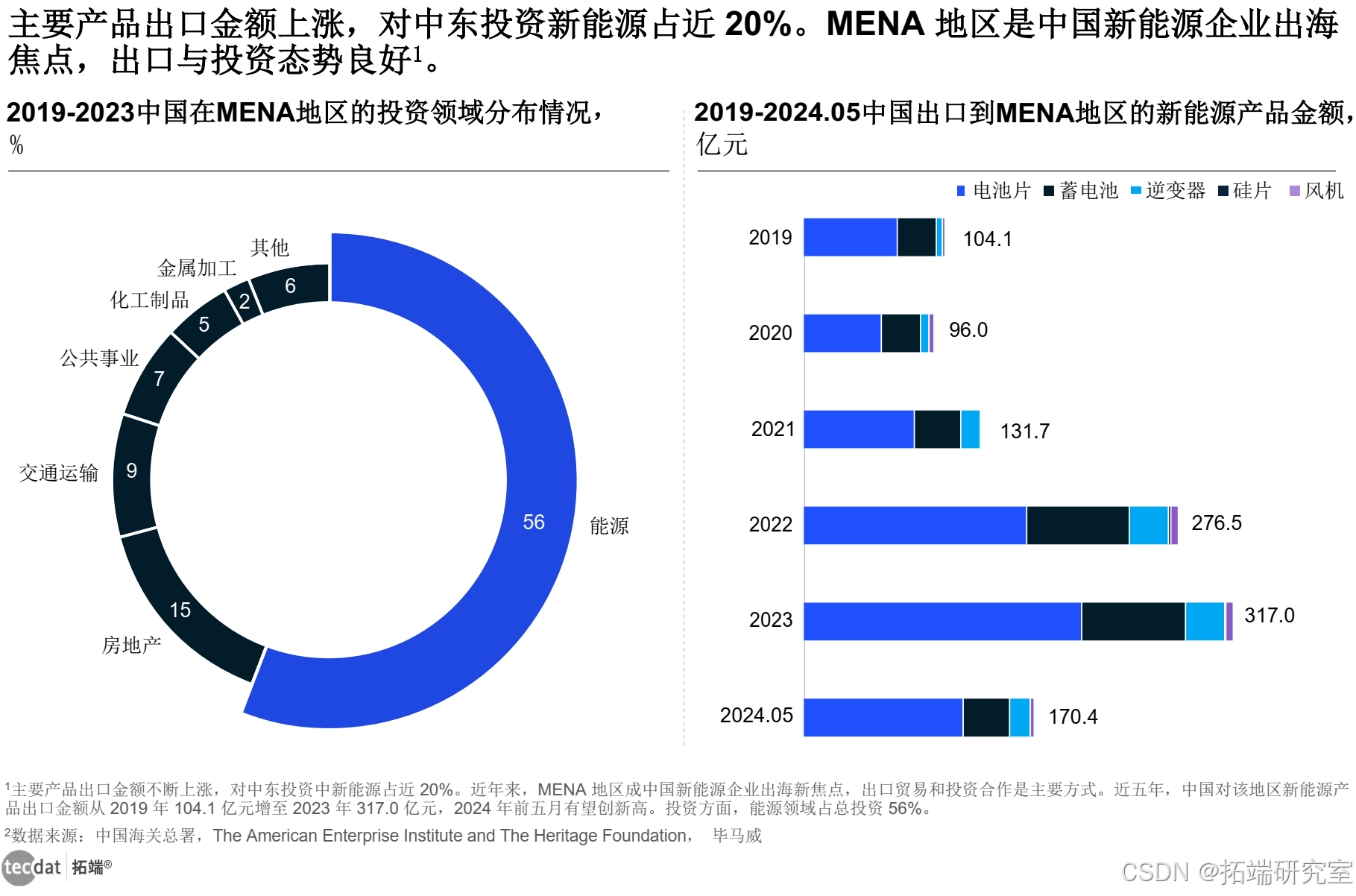 在出海方面,中国新能源企业在中东和北非(MENA)地区表现突出。主要产品出口金额持续上扬,在对中东的投资中,新能源占比接近20%。近年来,MENA地区已然成为中国新能源企业出海战略的全新焦点,其主要出海途径分为出口贸易与投资合作这两大类。