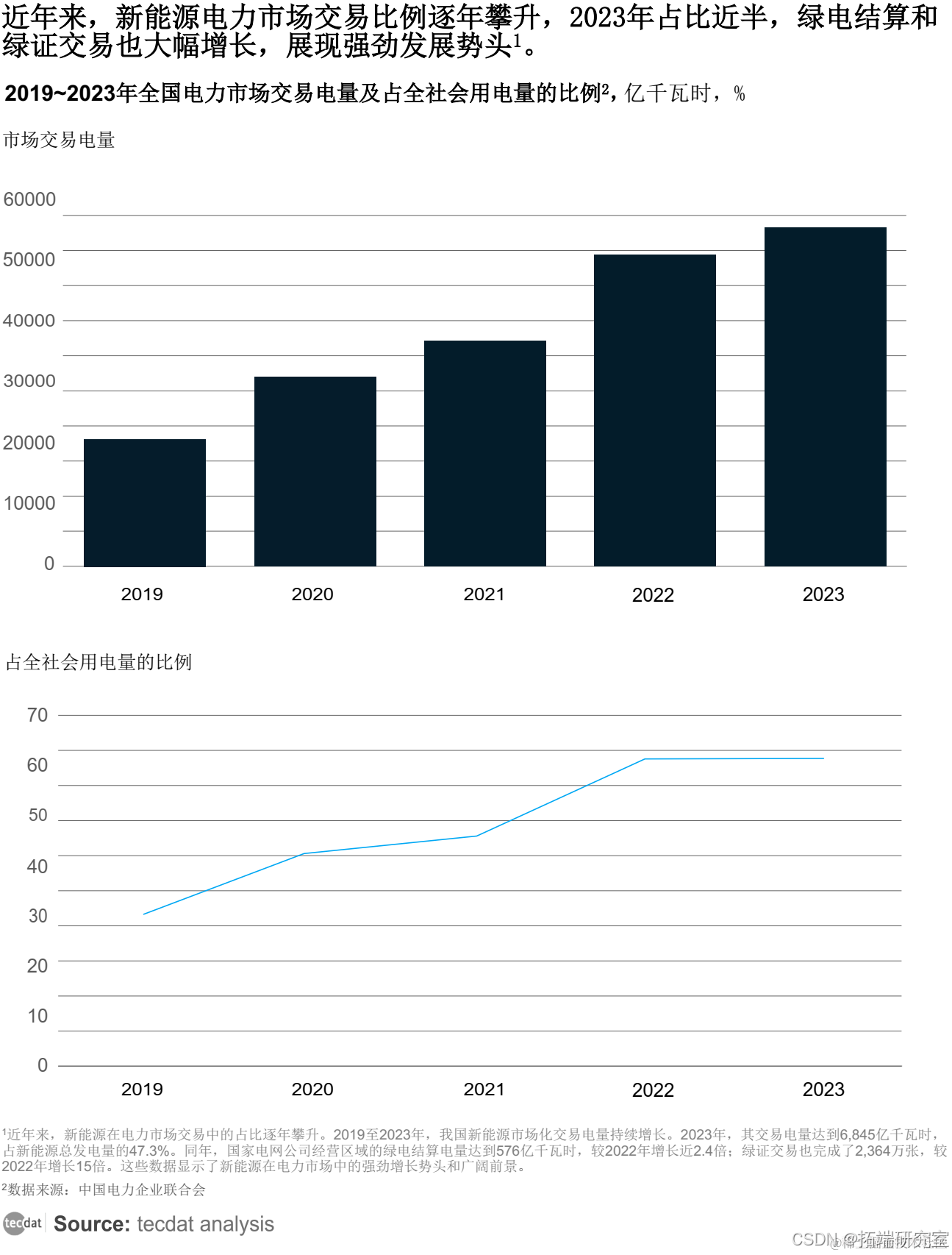 在能源转型的大背景下,新能源及储能参与电力市场交易的情况也备受关注。2019至2023年,我国新能源市场化交易电量持续增长,2023年更是达到6,845亿千瓦时,占新能源发电总量的47.3%。同年,国家电网公司绿电结算电量跃升至576亿千瓦时,绿证交易也激增15倍,达到2,364万张。